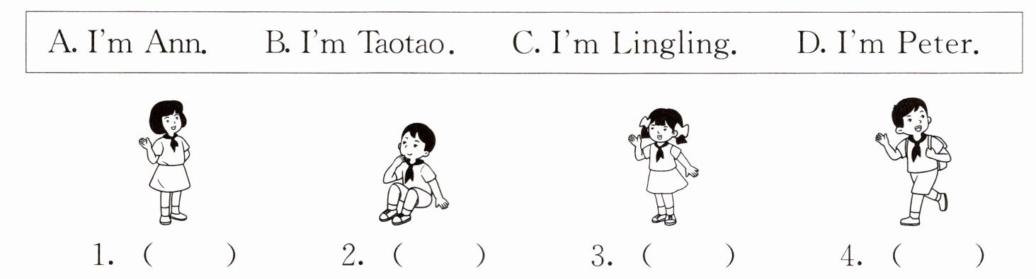 二、你认识以下新朋友吗?请你读句子,为他们选择方框中自我介绍的句子,并将其字母标号填在对应的括号里。