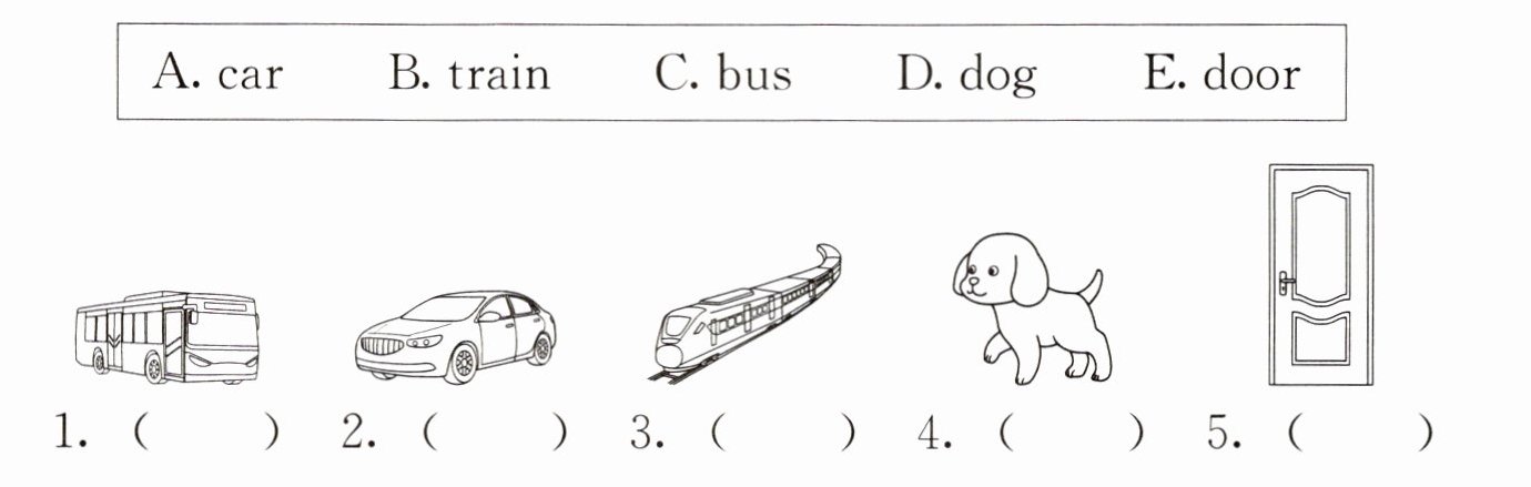 二、看图认单词。给下列图片选择正确的单词,并将其字母标号填在图下的括号内。