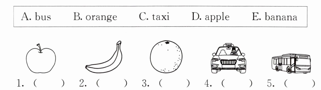 三、看图认单词。给下列图片选择正确的单词,并将其字母标号填在图下的括号内。