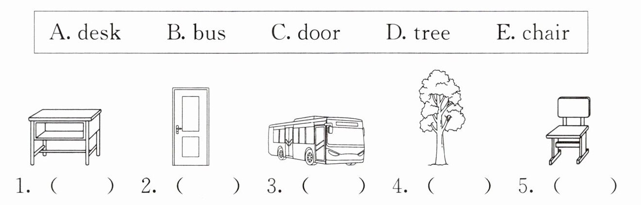 二、看图认单词。给下列图片选择正确的单词,并将其字母标号填在图下的括号内。