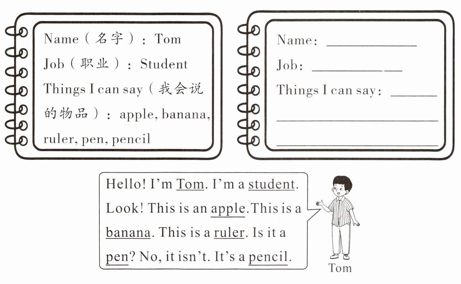 请你读一读左边卡片中 Tom 的信息,然后在右边的卡片中填入你的信息,再模仿 Tom 说的话,用英语和你的小伙伴们说一说或演一演。