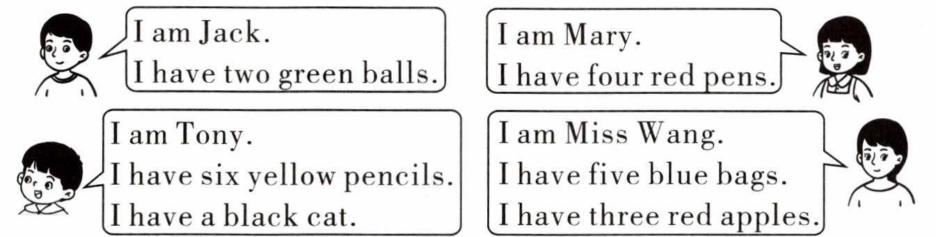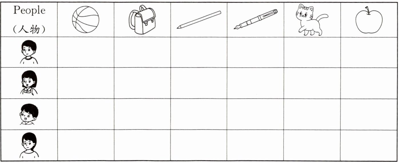 二、阅读语篇,根据语篇内容,判断以下人物拥有的物品以及数量,在对应的位置用英语或阿拉伯数字写出物品的数量,并给物品涂上对应的颜色。