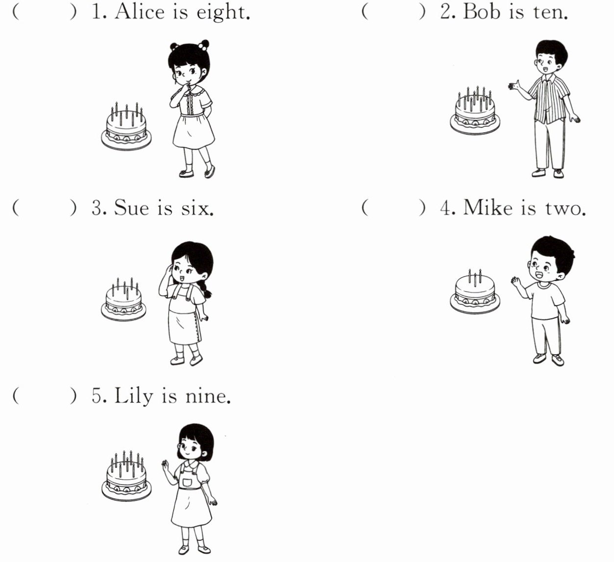 三、读一读下面的句子,判断下列句子与图片内容是否相符,相符的在括号内写“T”,不相符的写“F”。