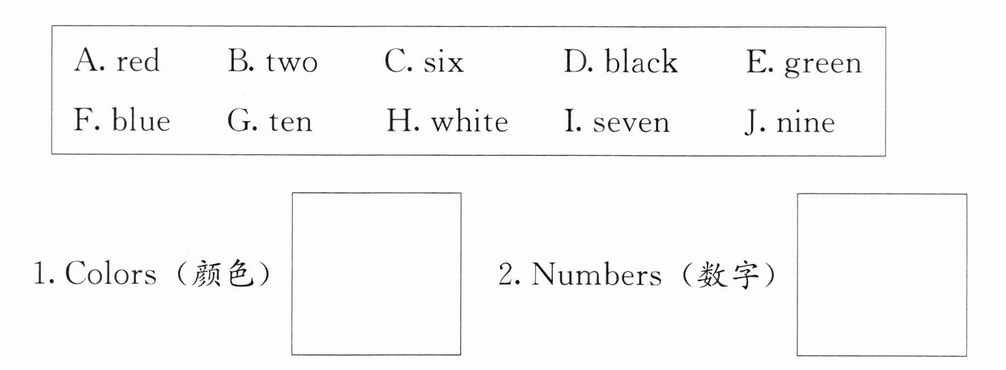 三、单词分类。请把单词按类别分类,并将其字母标号填到对应的方框中。