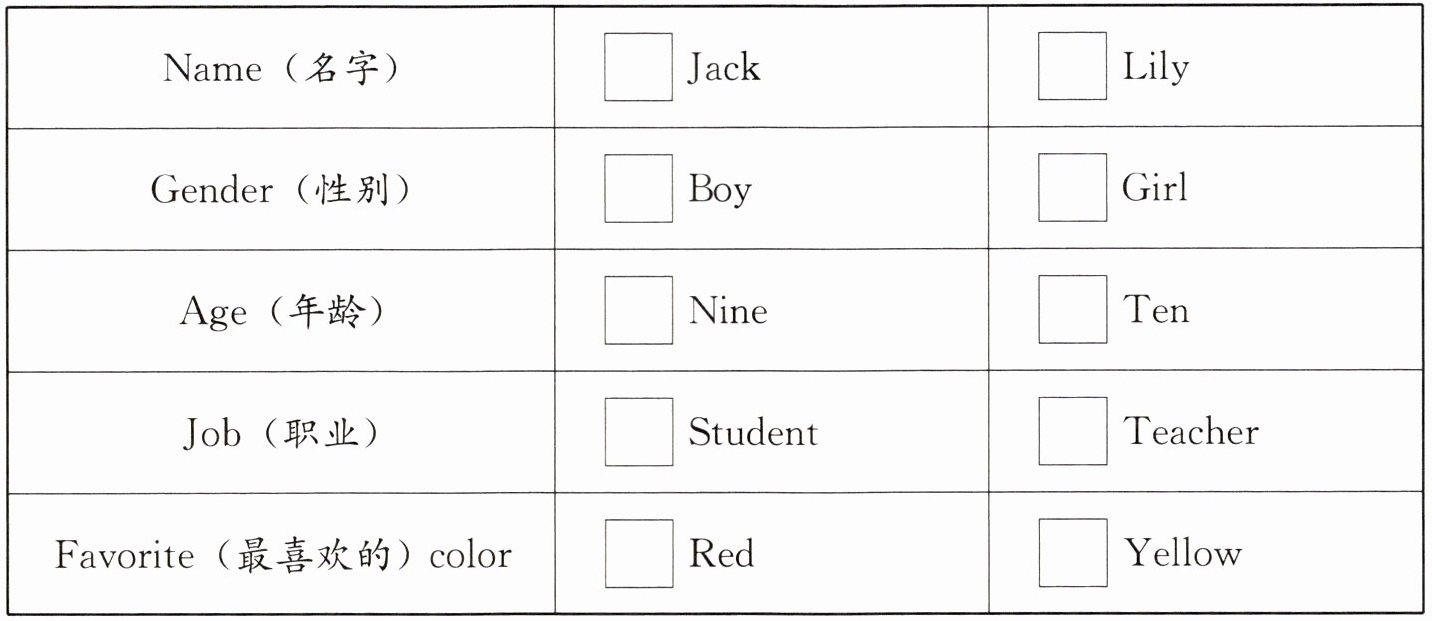 六、阅读理解。根据Jack的自我介绍,在对应信息前的小方框内画“√”,完成身份信息卡。
