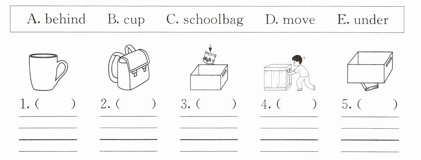 一、看图认单词。给下列图片选择相应的单词,将其字母标号填在括号内,并把该单词抄写在四线三格中。