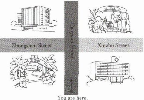 三、你学会怎么问路和指路了吗?请你结合以上录音,参考下面的地图,补全对话,和小伙伴们一起练习吧!