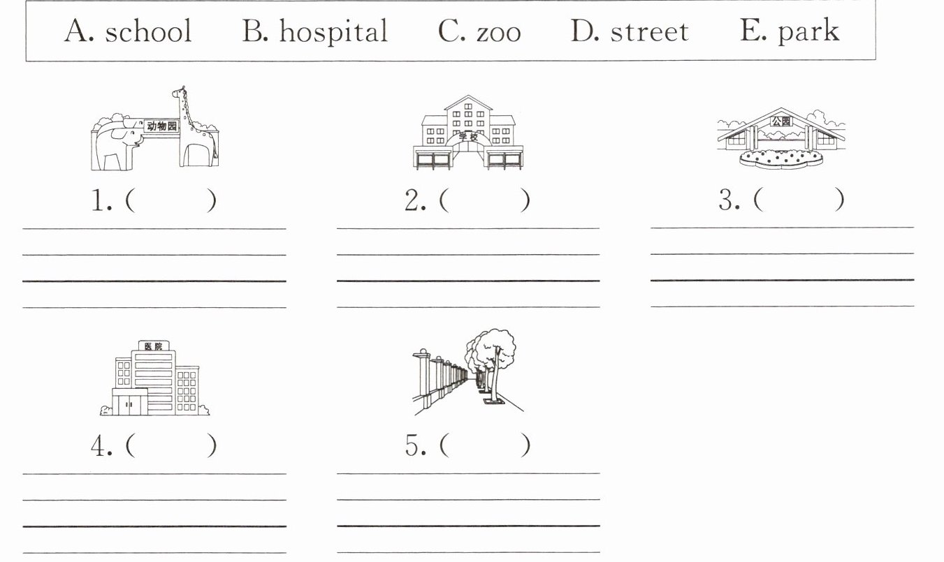 一、看图认单词。给下列图片选择相应的单词,将其字母标号填在括号内,并把该单词抄写在四线三格中。