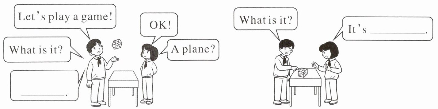 三、同学们,我们学习了很多生活中常见的物品。请你结合以上录音,补全下面的对话,和你的好朋友说一说吧!