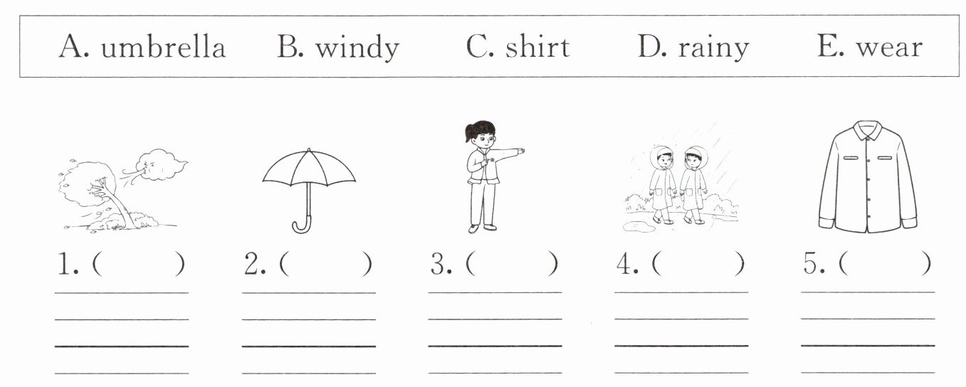 一、看图认单词。给下列图片选择相应的单词,将其字母标号填在括号内,并把该单词抄写在四线三格中。
