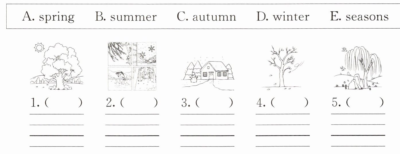 二、看图认单词。给下列图片选择相应的单词,将其字母标号填在括号内,并把该单词抄写在四线三格中。
