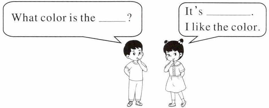 三、瞧!Tom 和 Linda 正在聊物品的颜色。请你结合录音内容,补全下面的对话,和小伙伴说说看到的物品是什么颜色的。
