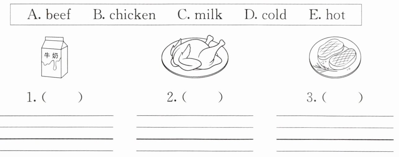 一、看图认单词。给下列图片选择相应的单词,将其字母标号填在括号内,并把该单词抄写在四线三格中。