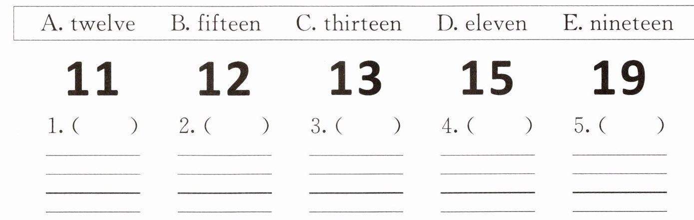 一、看图认单词。给下列图片选择相应的单词,将其字母标号填在括号内,并把该单词抄写在四线三格中。