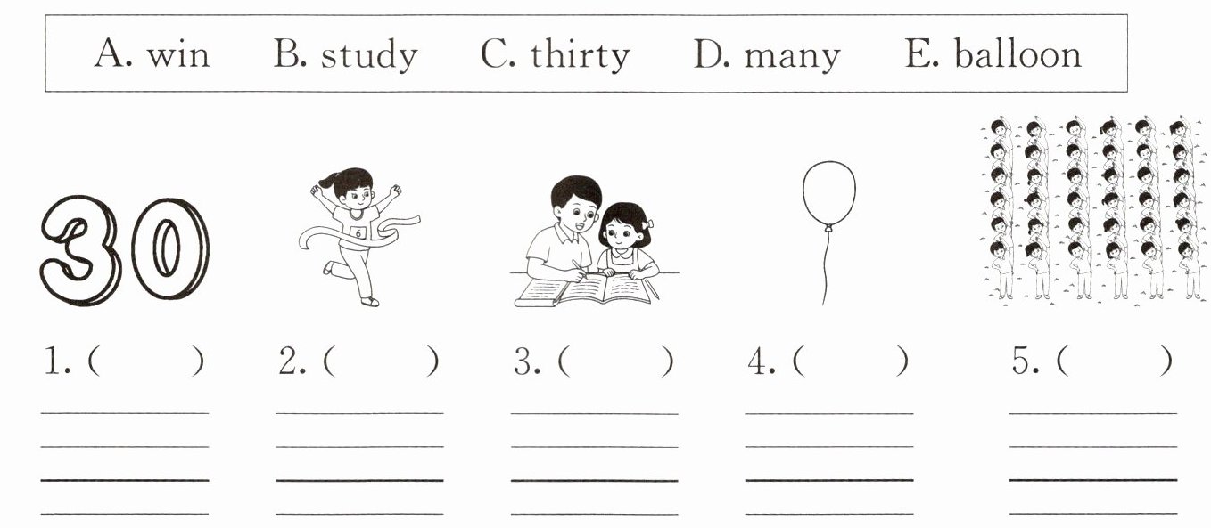 一、看图认单词。给下列图片选择相应的单词,将其字母标号填在括号内,并把该单词写在四线三格中。