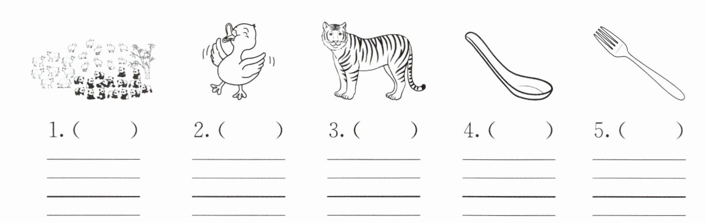 一、看图认单词。给下列图片选择相应的单词,将其字母标号填在括号内,并把该单词抄写在四线三格中。