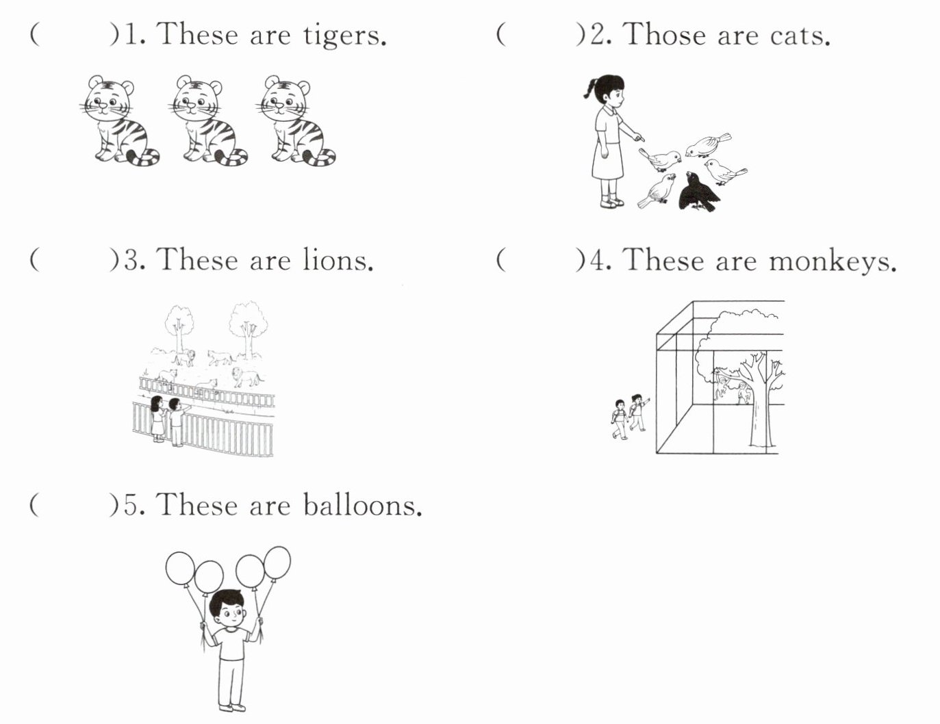 二、读一读下面的句子,判断下列句子与图片内容是否相符,相符的在括号内写“T”,不相符的写“F”。
