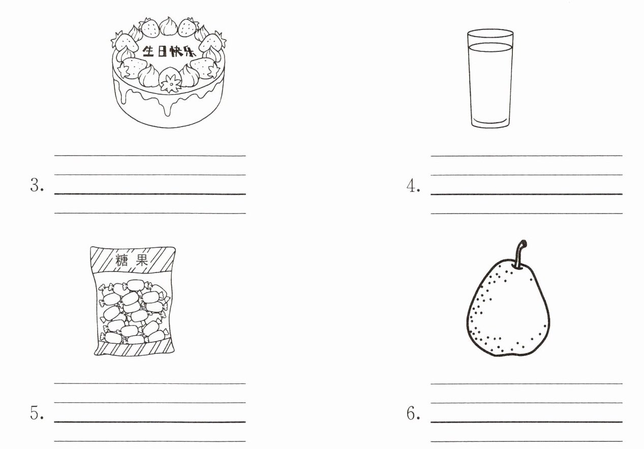1. milk 2. apple 3. cake 4. water 5. candies 6. pear