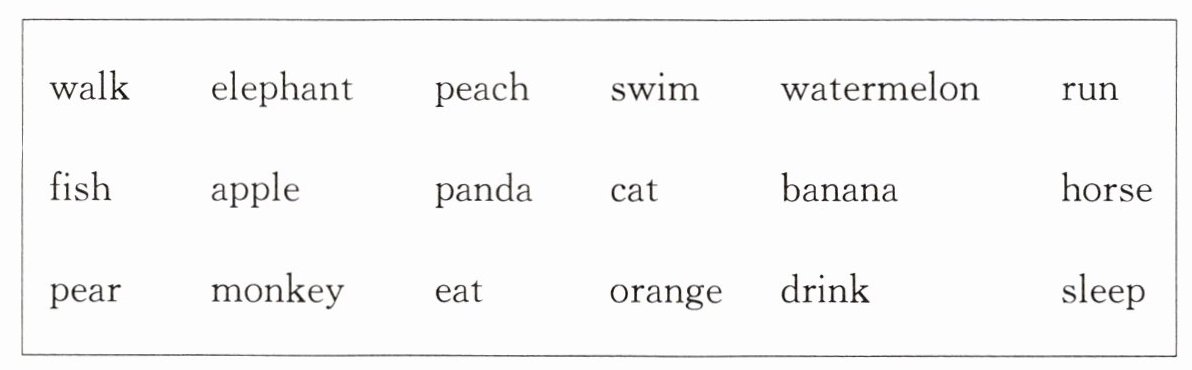 1. elephant, fish, panda, cat, horse, monkey 2. walk, swim, run, eat, drink, sleep 3. peach, watermelon, apple, banana, pear, orange