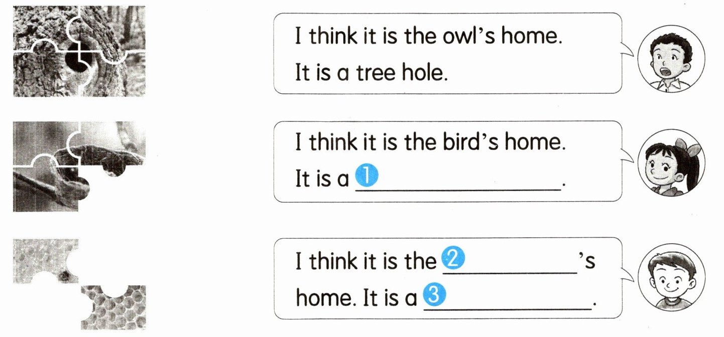 动物科普馆之旅开始了,同学们来到了第一站——动物互动区。他们在互动区玩拼图游戏,请你一起填一填、说一说吧!