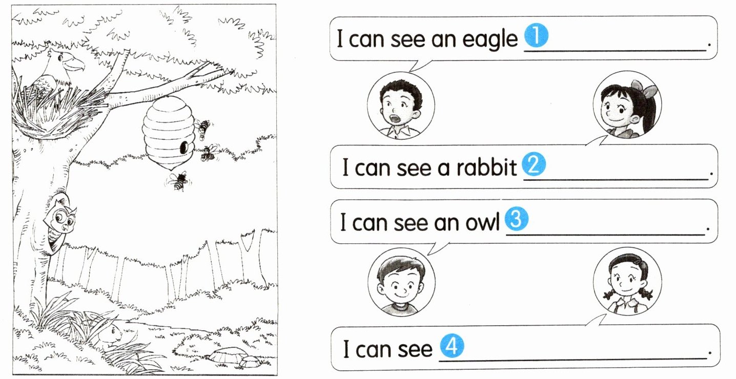 动物们正在玩捉迷藏,你能找到它们吗?看图,填空完成对话。
