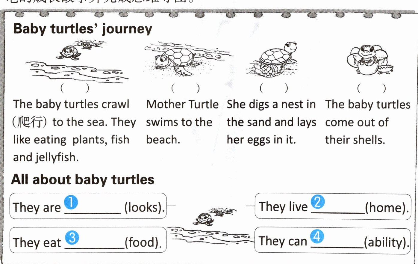 图片顺序:4 1 2 3;①small;②in the sea;③plants, fish and jellyfish;④crawl