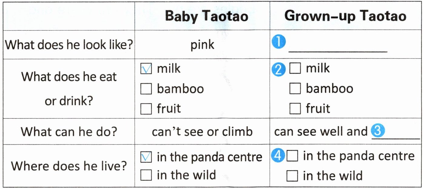 同学们来到了第四站——动物成长记录展。听一听熊猫淘淘的故事,把它的成长记录卡信息补充完整。