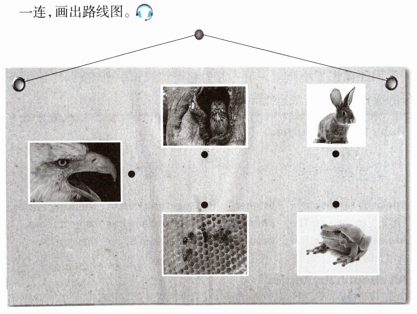 2. 瑶瑶正在班上分享她在动物科普馆的参观路线图。请你听一听,连一连,画出路线图。