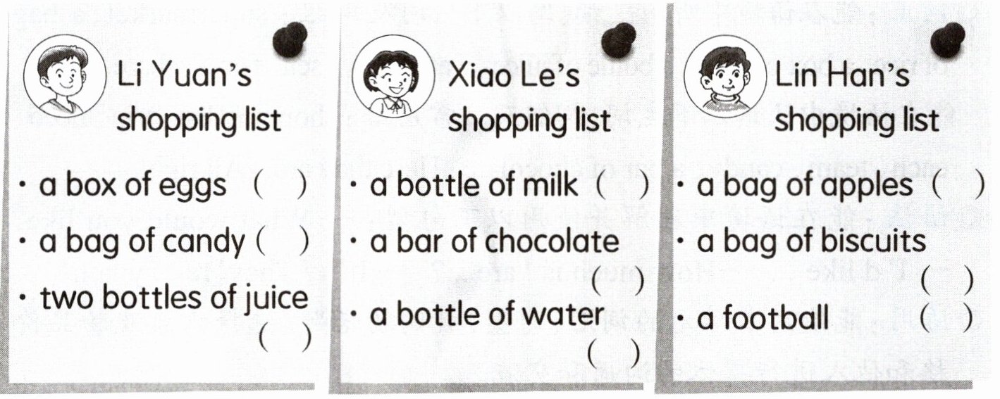 Li Yuan: a bag of candy, two bottles of juice;Xiao Le: a bottle of water, a bar of chocolate;Lin Han: a bag of apples, a football