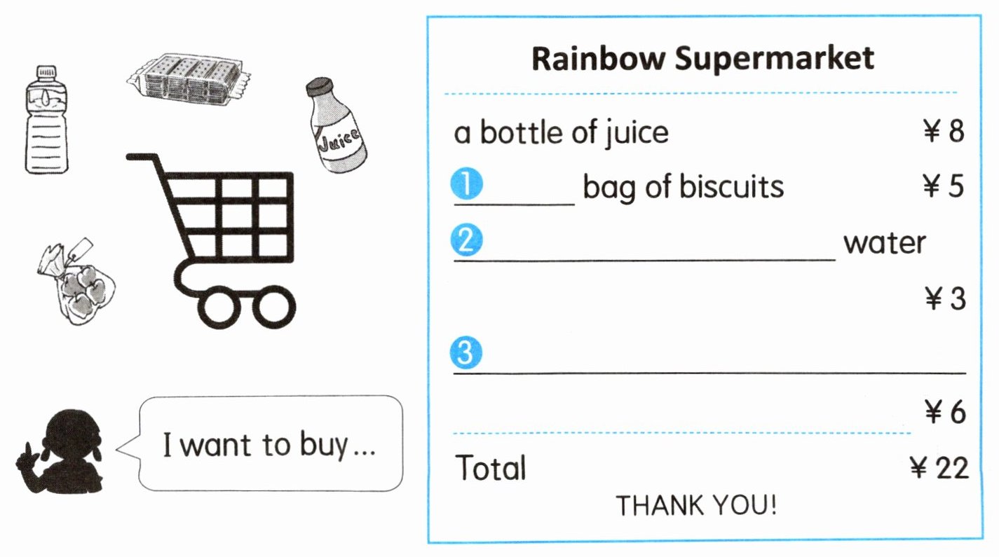 购物完成后,同学们在核对账单,但是购物小票弄脏了。你能帮他们清点吗?请你看一看,写一写,并说一说你想为秋游购买什么。