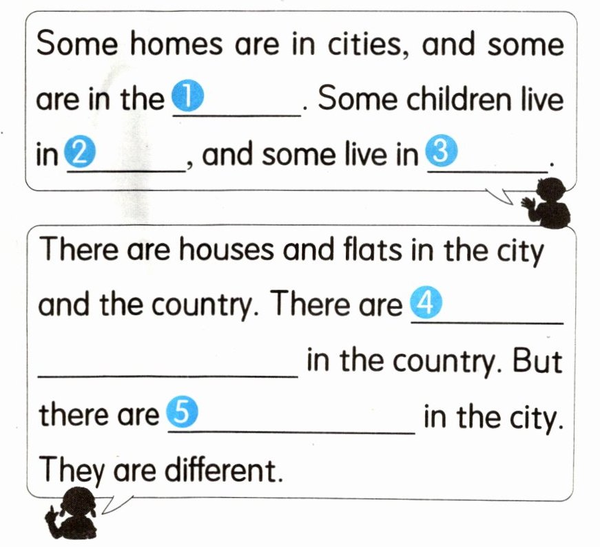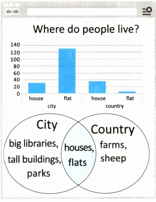 1.country 2. houses 3. flats 4. farms and sheep 5. big libraries, tall buildings and parks