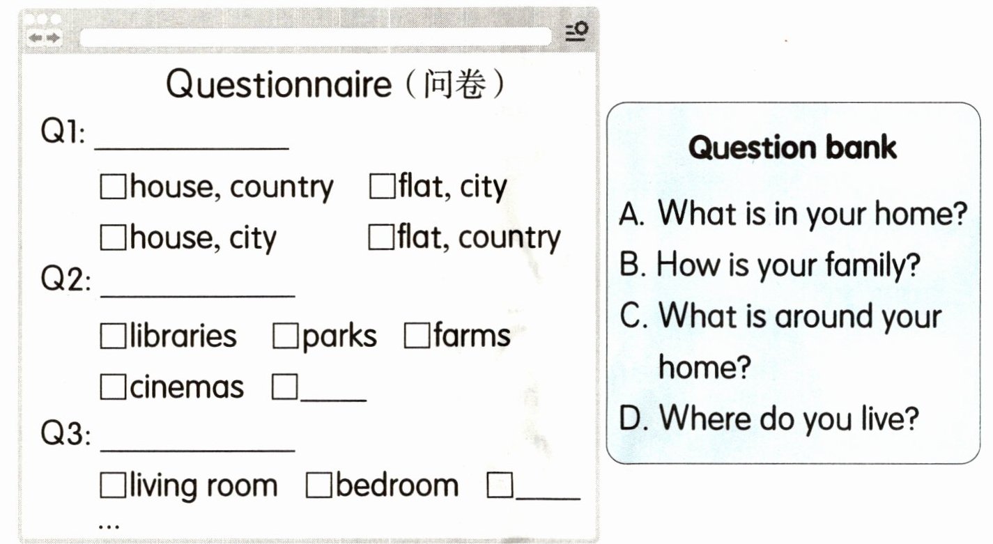 研学第二天,同学们打算开展线上采访调研,了解姐妹学校小学生的居住情况。你能帮助他们选择合适的采访提问吗?