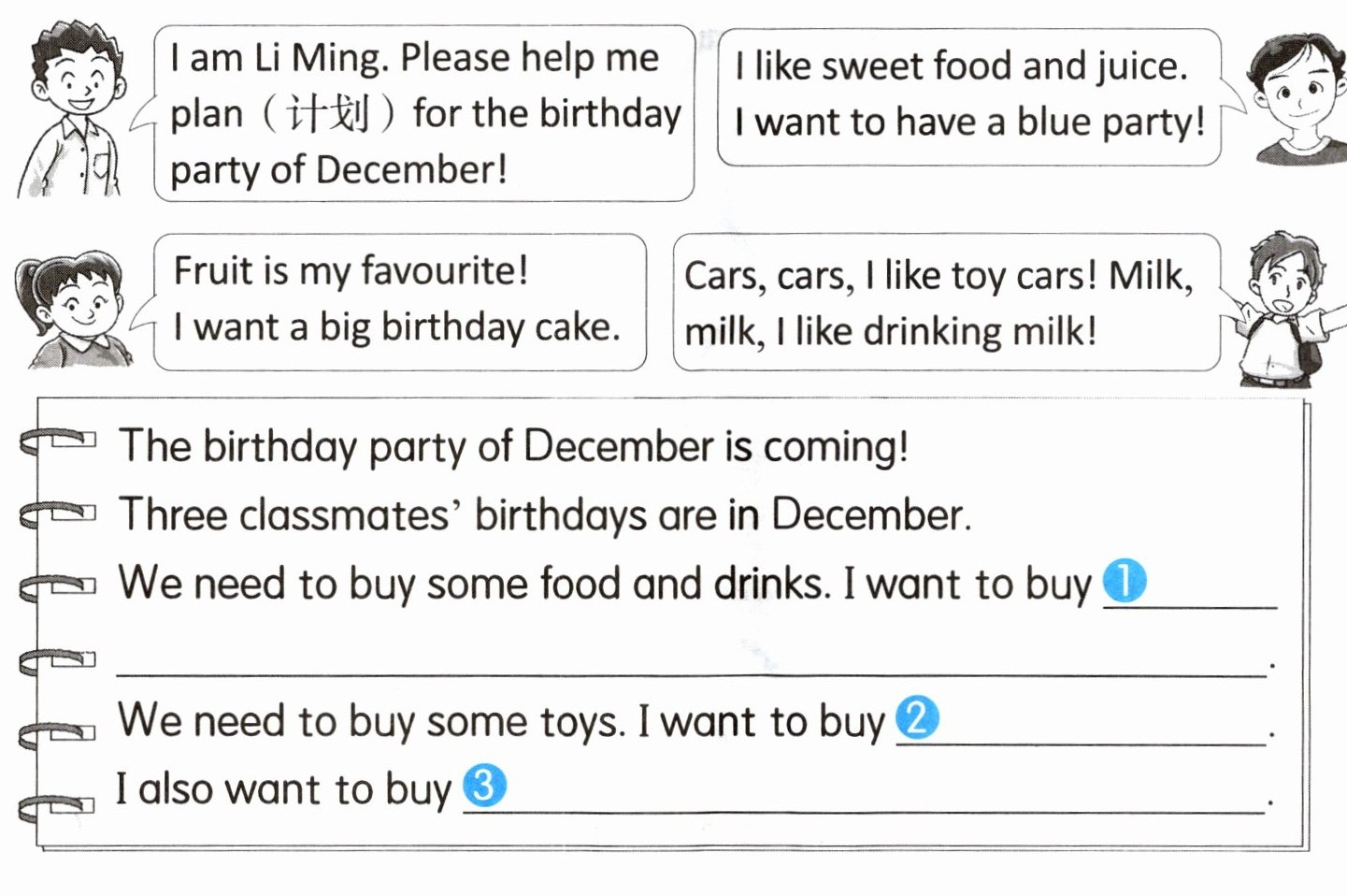 4. 李明是集体生日会的策划人。请你读一读三位小寿星的需求和喜好,帮李明一起策划一下吧!