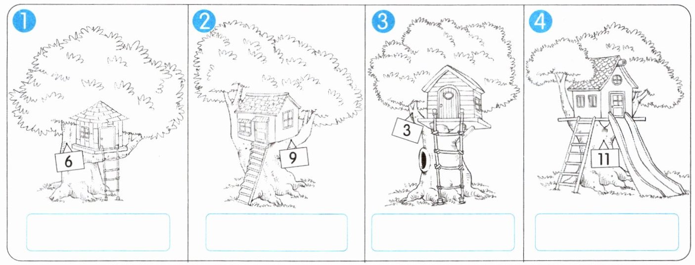 小朋友们想体验树屋生活,但只有解锁密码才能成功入住。你能根据线索找到他们各自的树屋吗?请把主人的名字写在树屋标识牌上吧(如 Tom's house)。