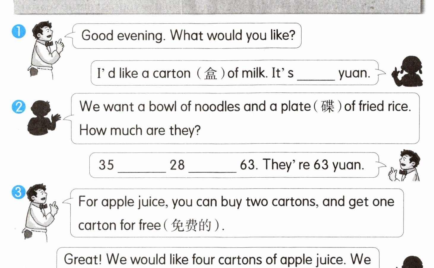 Great! We would like four cartons of apple juice. We need to pay (支付)