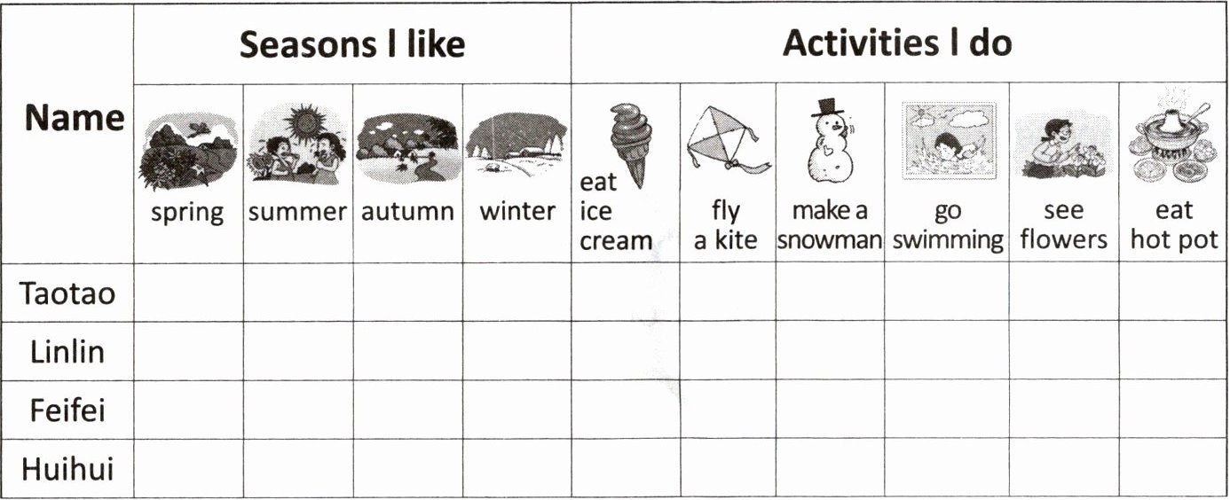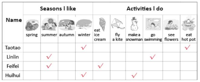 研学活动的第三天,学校开展了“我爱的季节”校园调查。请你听一听,在表格里打“√”,帮助小记者完成调查表吧!