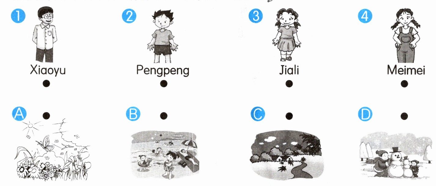 3. 在“四季嘉年华”的电话连线区,小朋友在打电话询问外国小朋友所在国家的季节。请你读一读,选择合适的句子,将对话补全。