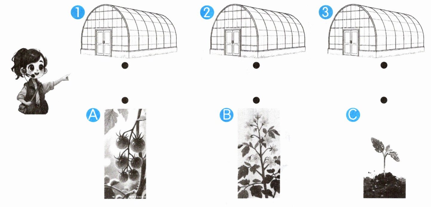 同学们来到种植基地秋游。种植基地里有神奇的大棚 (greenhouse)。听一听科普博士的介绍, 了解每个大棚里的番茄是什么样的, 连线。