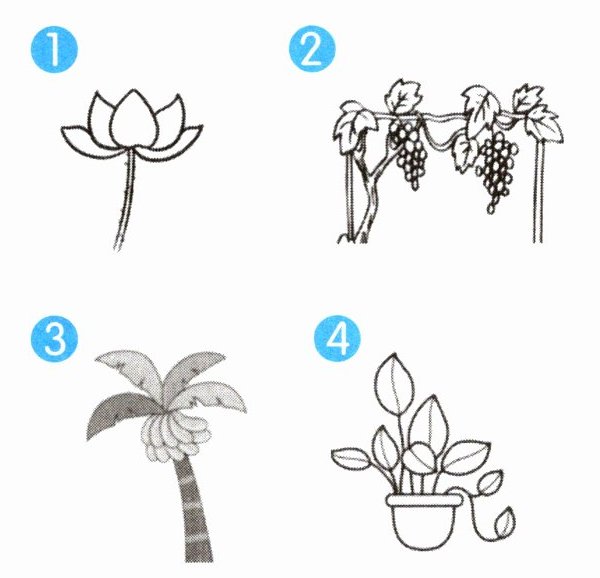 同学们到了种植基地的科普馆。科普博士正在介绍植物。晴晴仓促间记录得不完整, 请你听一听, 用彩笔画全植物形态吧。