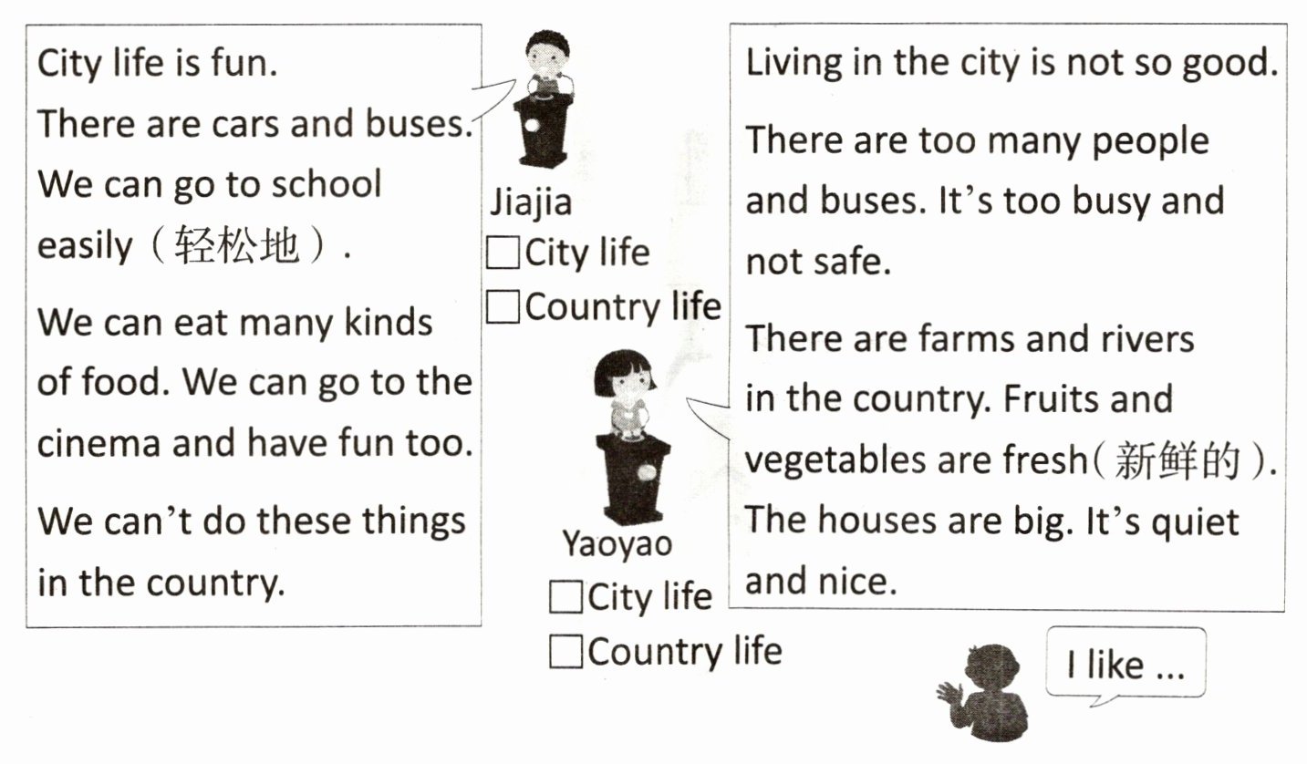 佳佳和瑶瑶对城乡生活有不同的看法。他们分别喜欢哪种生活?请打“√”。你喜欢城市生活还是乡村生活呢?请和同学们开展辩论。