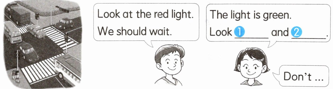 Look at the red light. We should wait. The light is green. Look ①___ and ②___. Don't...