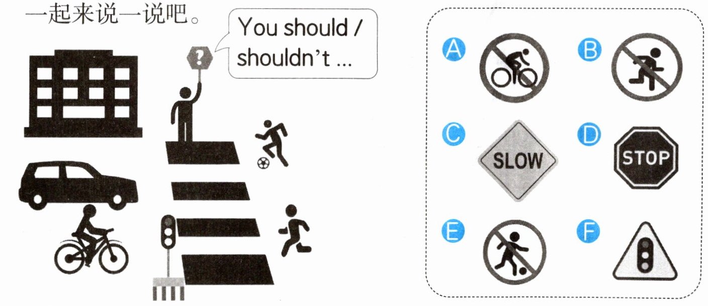 放学时段, 校门口的交通非常拥堵。辰辰跟随交警叔叔, 正在指挥交通。辰辰会给司机、骑行者和行人举哪个标志、提什么建议呢? 你也一起来说一说吧。