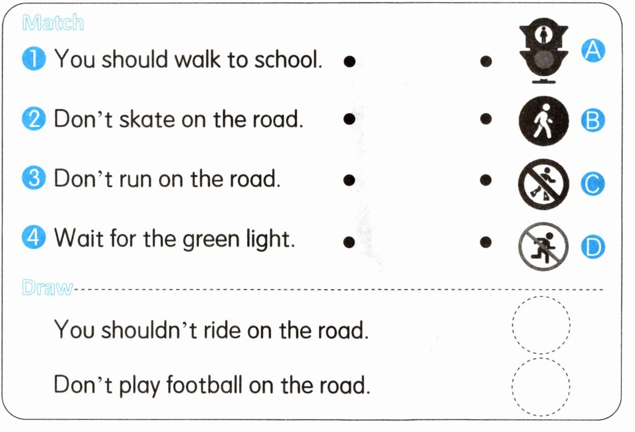 辰辰在 “小交警训练营” 制作趣味交通安全折页, 你能帮忙完善配图吗? 请连线并画一画。