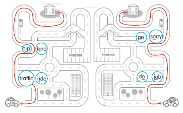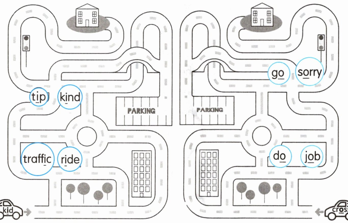 1. 训练营结束后, 同学们在游戏区玩, 他们需要根据划线字母发音相同的标志牌, 帮助迷路的汽车找到回家的路。你能帮他们画出路线指引司机吗?