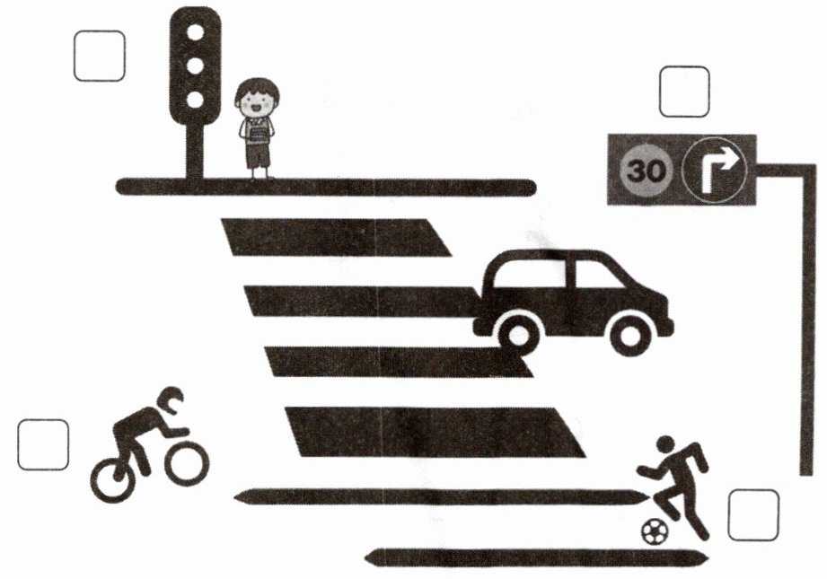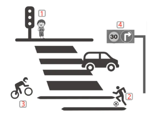 2. 辰辰通过考核成了 “实习小交警”。他现在在学校旁边的路口给同学们介绍交通规则, 请你听录音, 给图片排序。