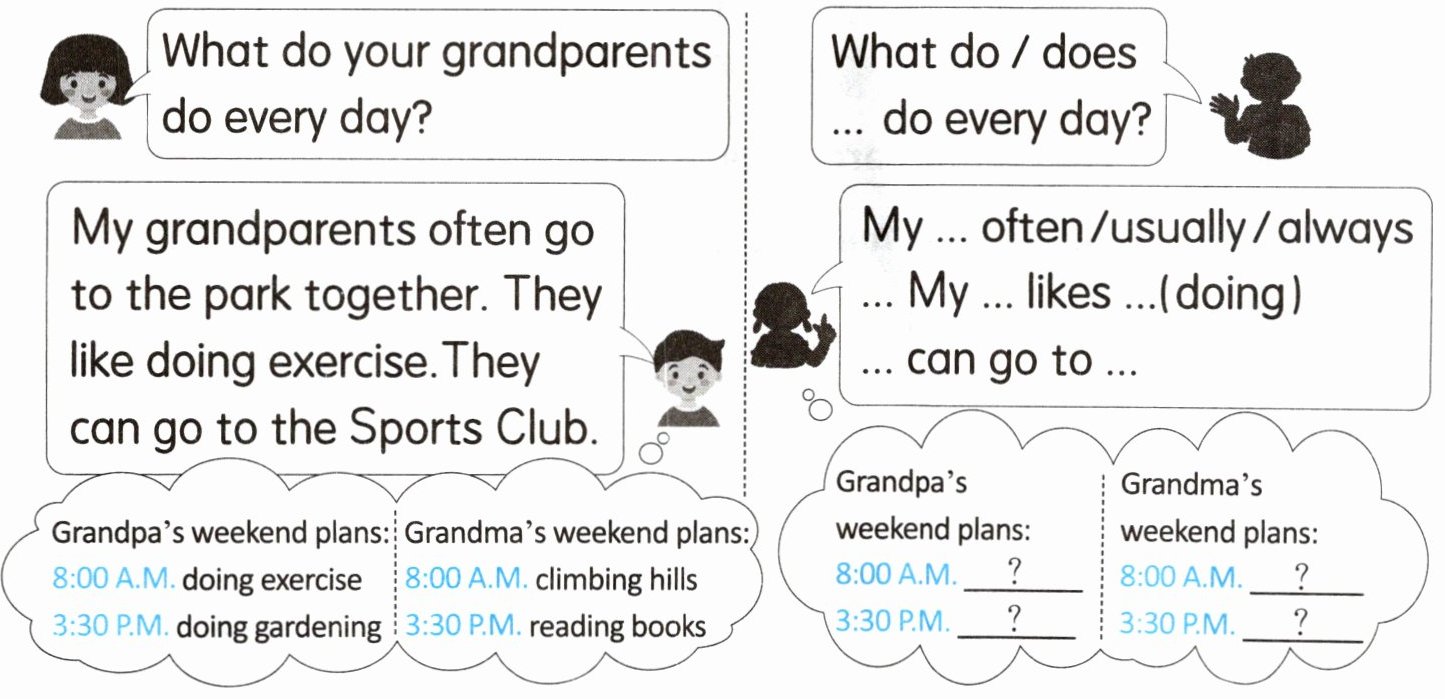 - What do your grandparents do every day?\nMy grandparents often go to the park together. They like doing exercise. They can go to the Sports Club.\nGrandpa’s weekend plans: 8:00 A.M. doing exercise; 3:30 P.M. doing gardening\nGrandma’s weekend plans: 8:00 A.M. climbing hills; 3:30 P.M. reading books