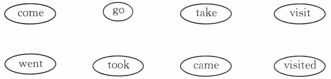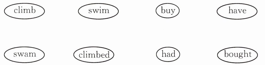 come—came go—went take—took visit—visited climb—climbed swim—swam buy—bought have—had