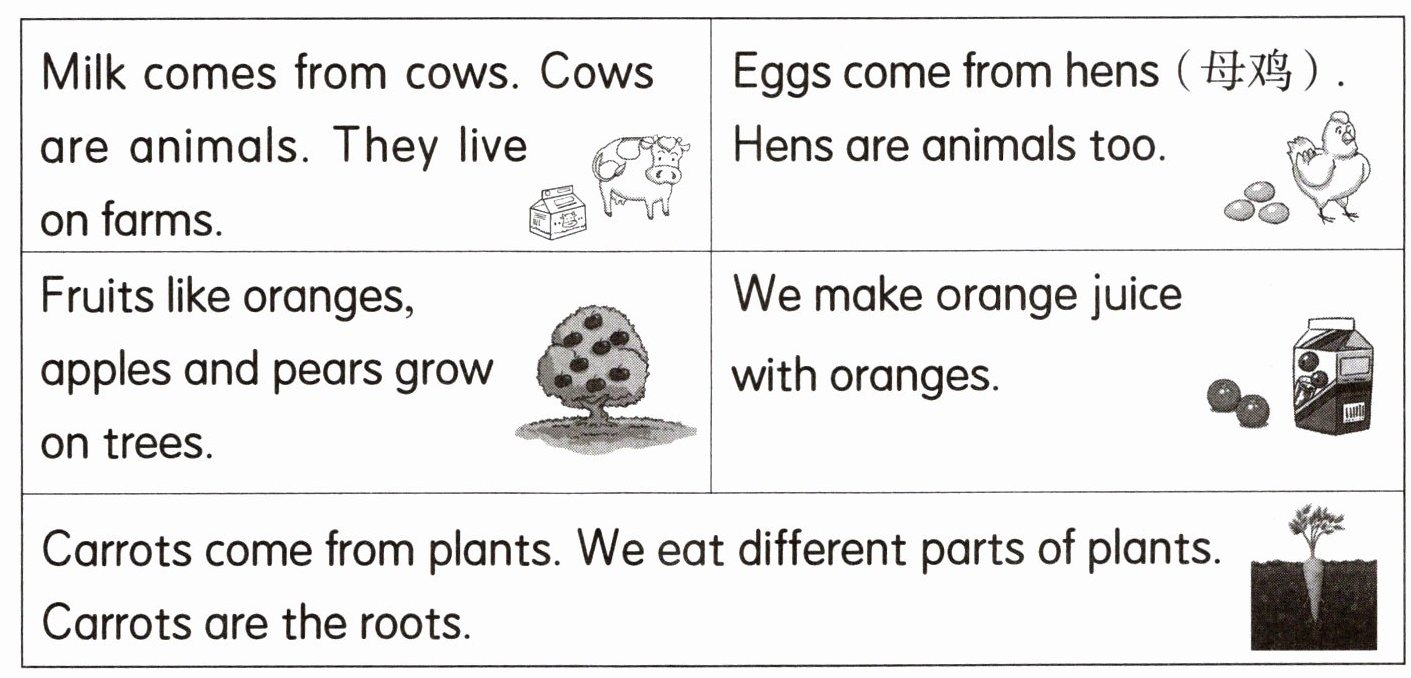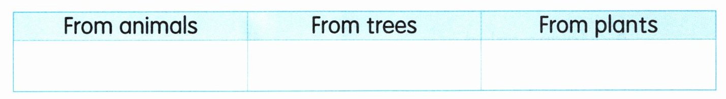 3. 我们每天吃的食物都来自哪里呢?请读一读,将食物按来源分类。