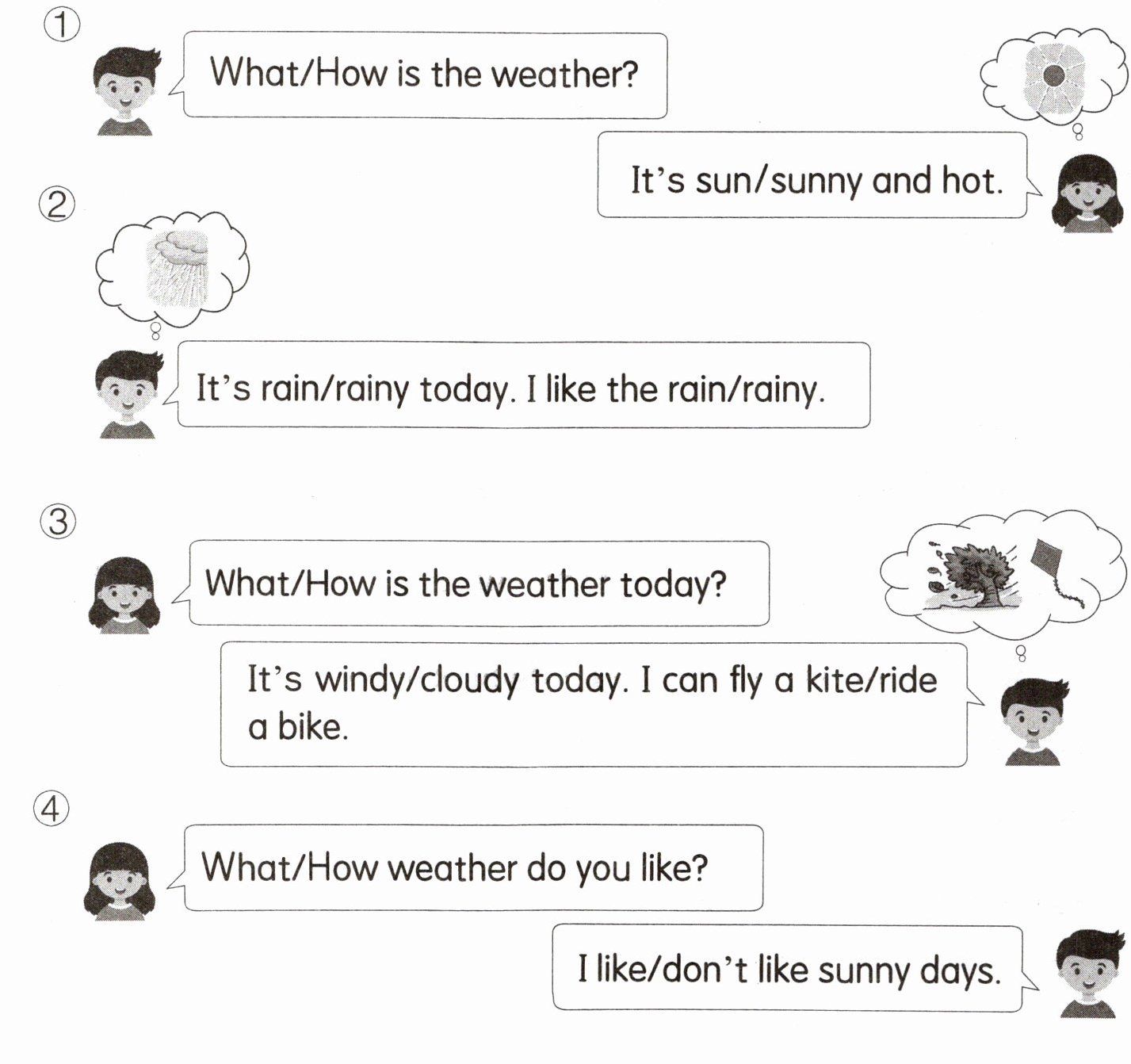 1. 听一听,下面的几位小朋友在不同的天气分别能做什么? 请在相应的图片旁边打“√”。