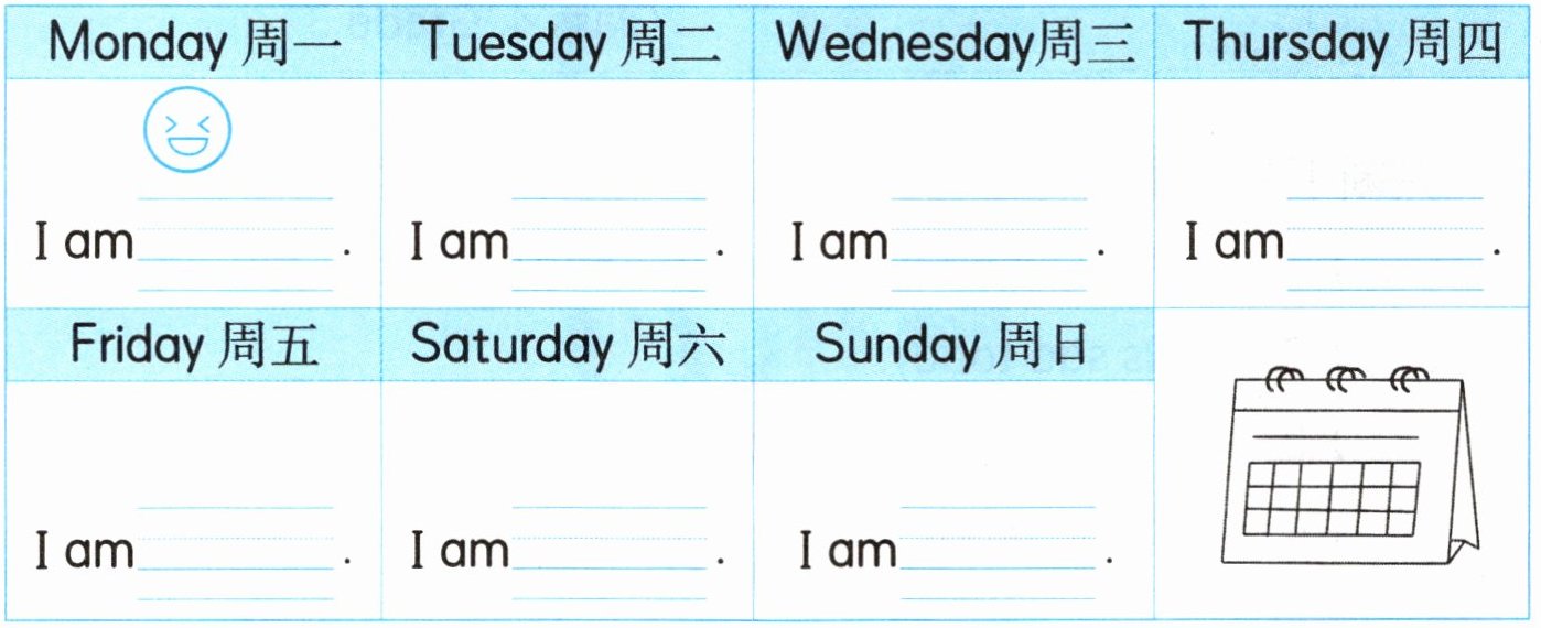 | Monday周一 | Tuesday周二 | Wednesday周三 | Thursday周四 | Friday周五 | Saturday周六 | Sunday周日 |
